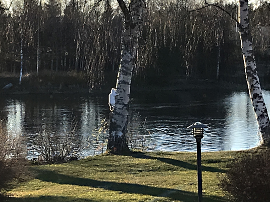 Mies sanoo, että kuvassa oleva valkoinen kissa on vieraillut kyseisen koivun juurella aamuisin ja iltaisin. Eräänä päivänä se havahtui ja hyppäsi yhdellä loikalla noin 150 senttimetrin korkeuteen, tarrautui koivunrunkoon kiinni ja saman tien pöntölle, josta oli vähällä saada aikuisen telkän saaliikseen.