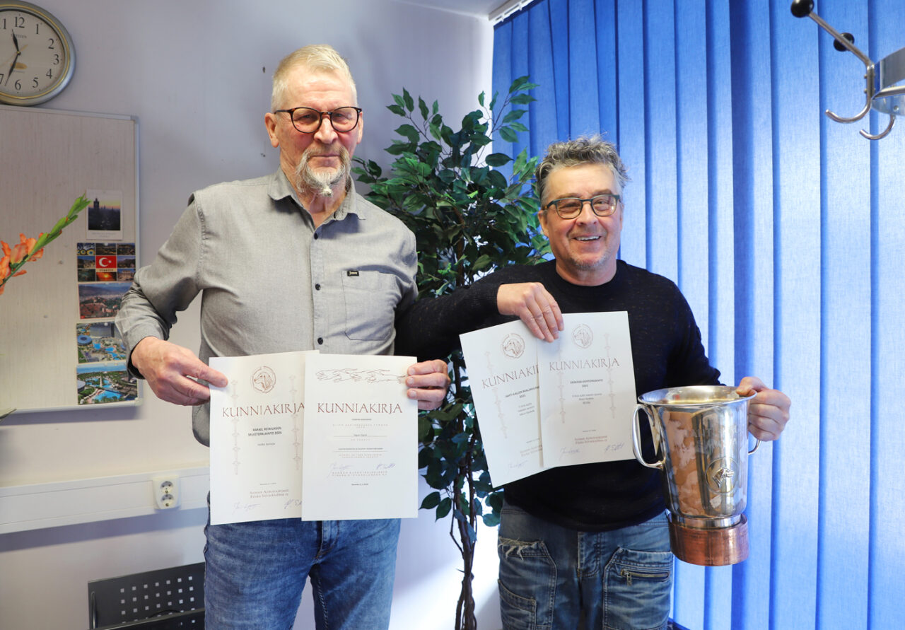 Pitkän linjan ajokoiramiehet, Tapani Sipilä ja Mauri Koskela saapuvat SeutuMajakan toimitukseen leveä hymy kasvoillaan. Ja syystäkin. He nimittäin vastaanottivat muutama päivä sitten palkinnot Suomen Ajokoirajärjestön vuosikokouksessa Kouvolassa. Tapani Sipilälle luovutettiin kultainen ansiomerkki. Hänen mukaansa kriteerit palkinnon myöntämiselle olivat täyttyneet jo 10 vuotta sitten, mutta parempi myöhään kuin ei milloinkaan. Hän on tuomaroinut vuosikymmenien aikana satoja ajokoekilpailuja, toiminut kaksi kertaa Pohjois-Pohjanmaan Ajokoirakerhon puheenjohtajana ja istunut kaksi kertaa myös Suomen Ajokoirajärjestön hallituksessa.