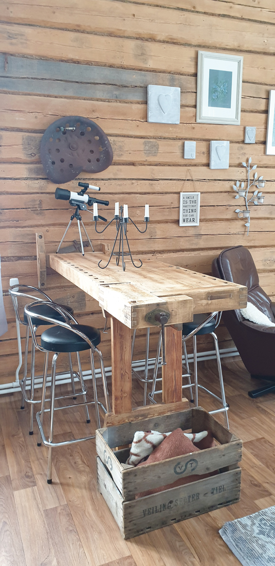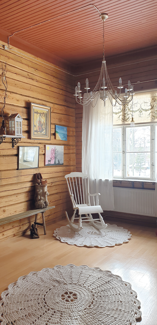 ”Kiinnostuin sisustamisesta siinä määrin, että halusin suorittaa alan ammattitutkinnon. Opiskelin Kalajoen Artemassa vuoden työn ohella ja valmistuin sisustusalan ammattitutkinnosta vuonna 2017. En tee sisustussuunnitelmia työkseni, mutta olen antanut pyydettäessä ystäville vinkkejä esimerkiksi jonkin hankalan nurkkauksen kalustamiseen. Koulutuksesta sai perustan esineiden asetteluun ja sijoitteluun, siihen on tietty kaava. Luen myös paljon sisustuslehtiä ja niistä saa paljon vinkkejä, miten yhdistää modernia ja vanhaa”.